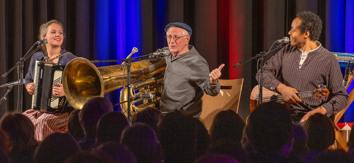 Hans Well, bekannt vom ehemaligen Kabarett-Trio Biermösl Blosn, mit seiner Tochter Sarah Well und dem vielseitigen Musiker Komalé Akakpo brachten gleich zu Beginn mit einem Eröffnungsgstanzl die Besucher auf ihre Seite, wussten sie doch so Einiges aus dem Mainburger und Hallertauer Leben zu besingen. Ob jetzt Mainburg eine Grünen-Hochburg sei – wegen der grünen Bänder durch die Stadt – oder der Ordensvergabe für den Erhalt des Polizeigebäudes bis hin zur Krankenhaus-Problematik, kaum ein Stadtgespräch wurde bei den Gstanzl ausgelassen.